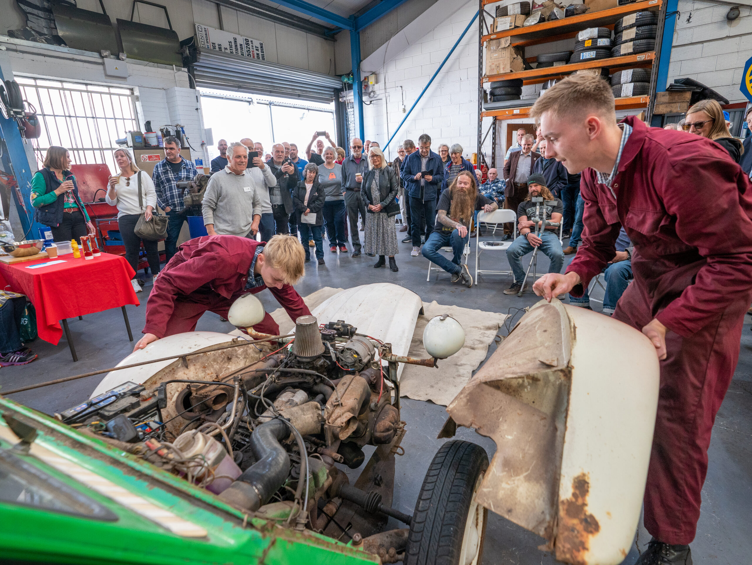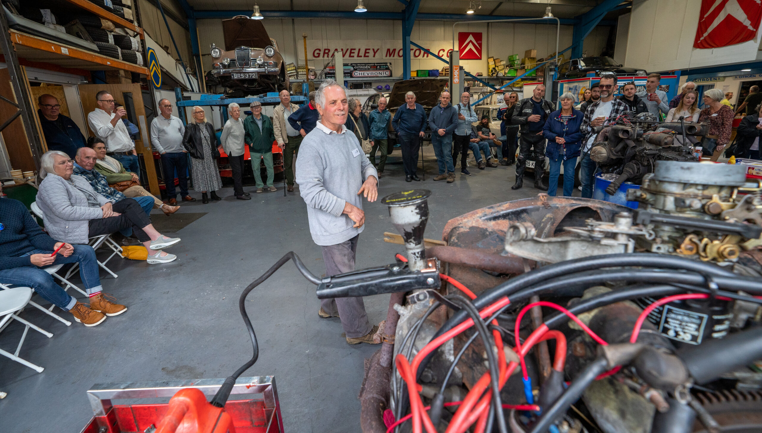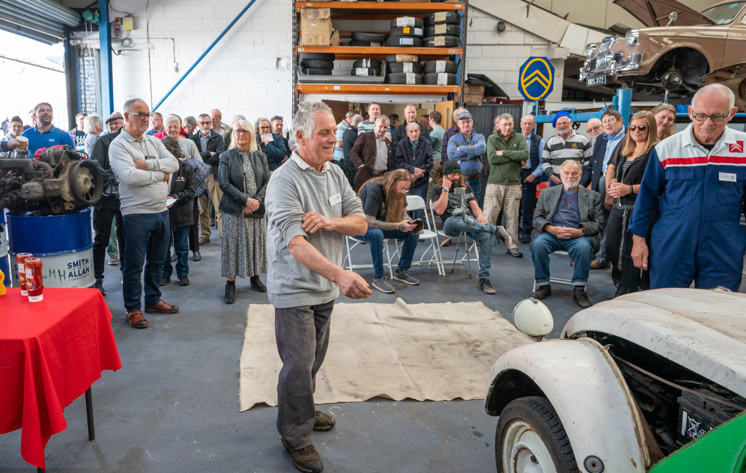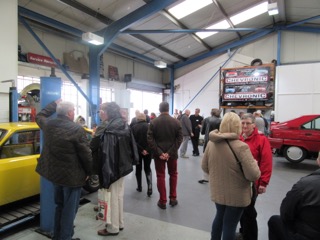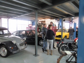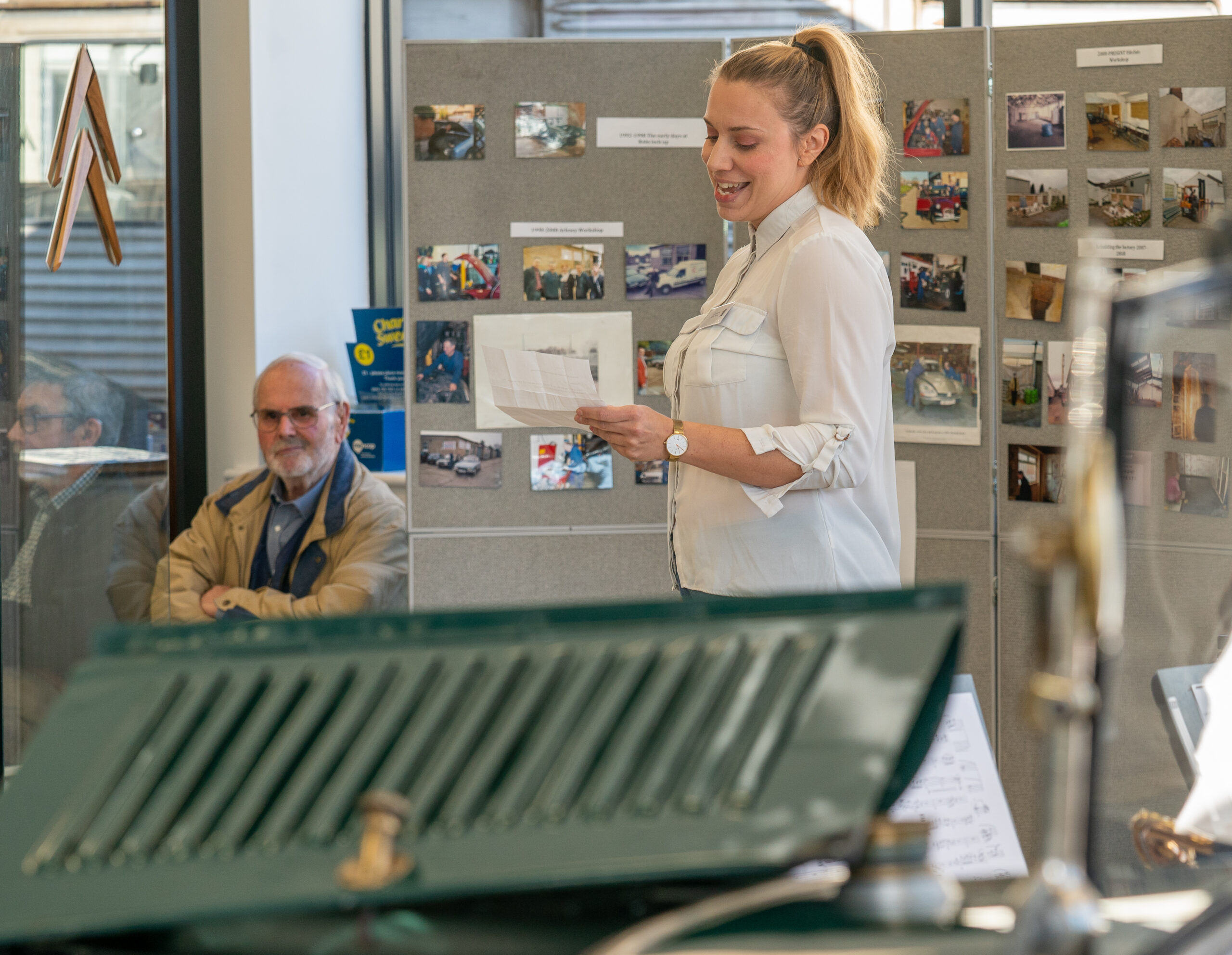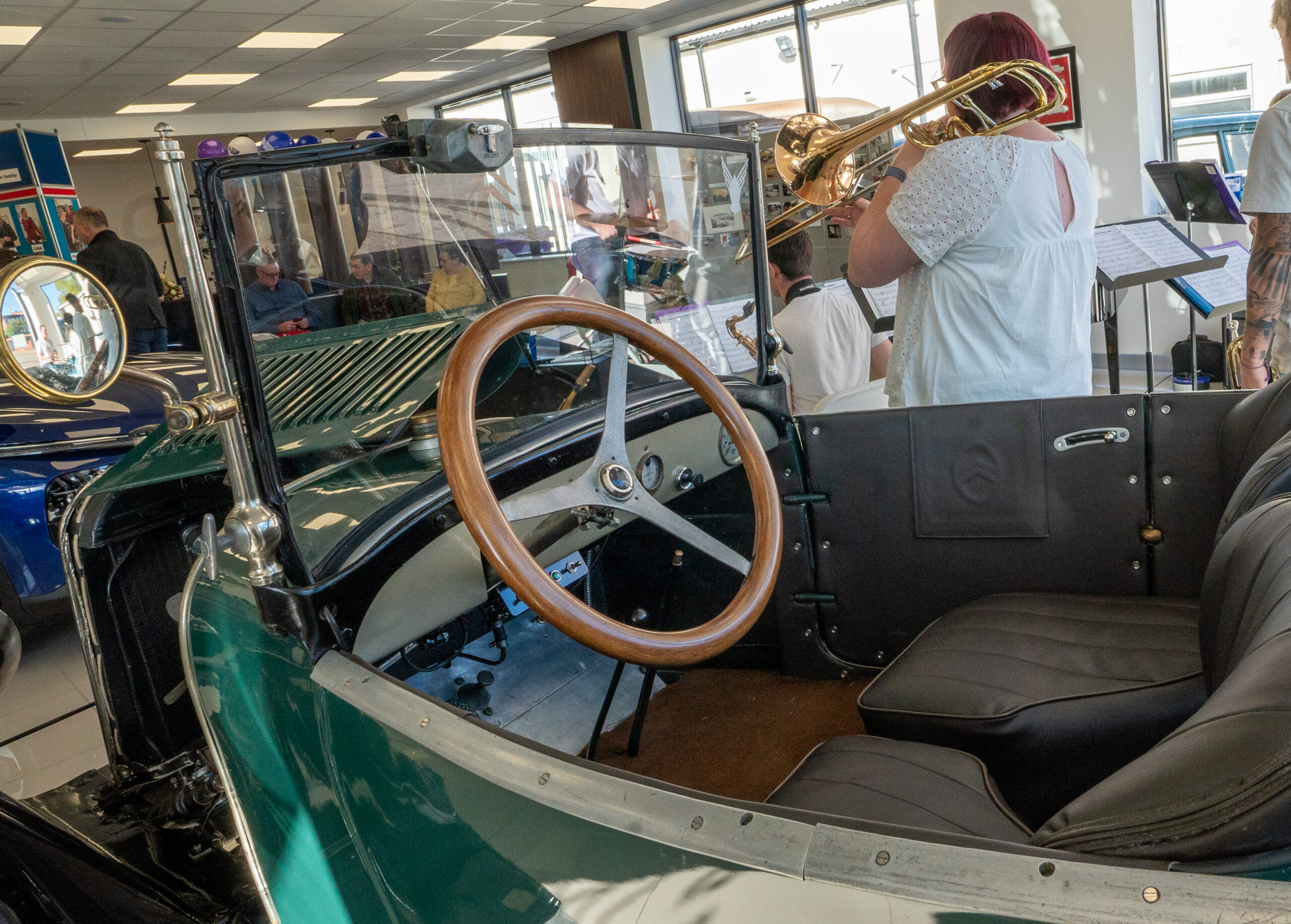 The open day had a programme of events running , spectators could see a windscreen being removed and refitted. An engine being run on a bench. There was a speech talking about vehicle restoration , a jazz band for visitors to relax and enjoy.