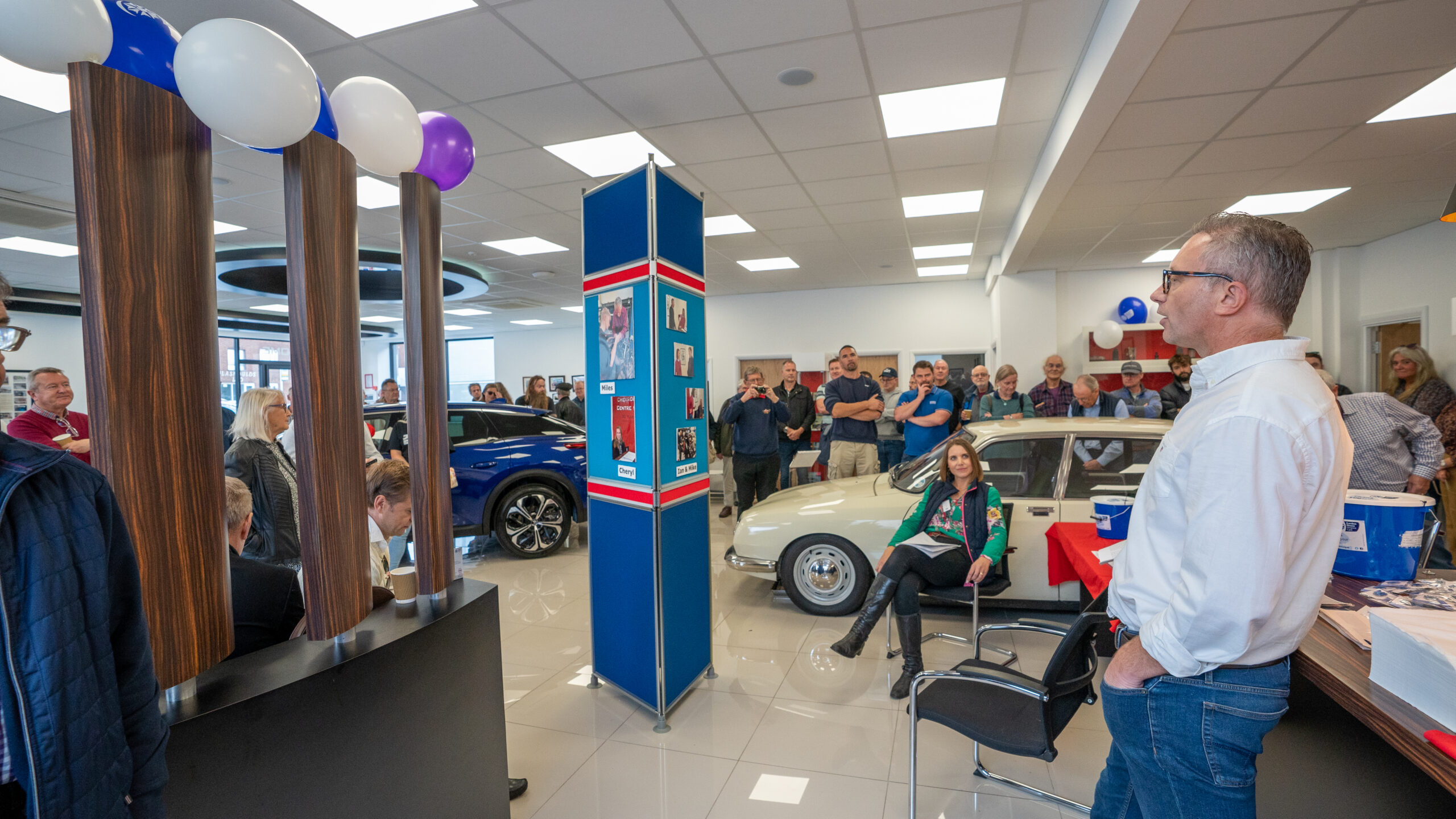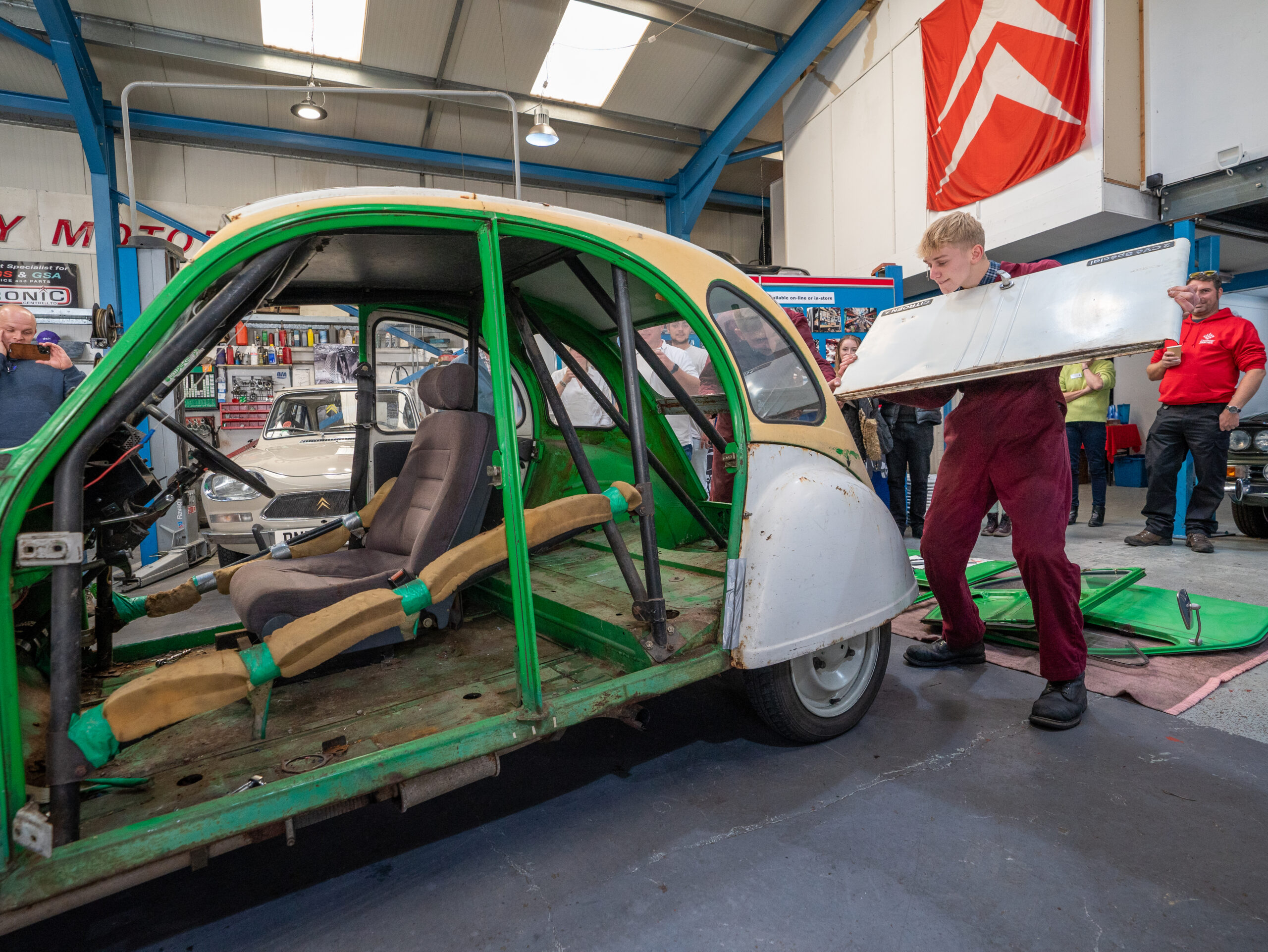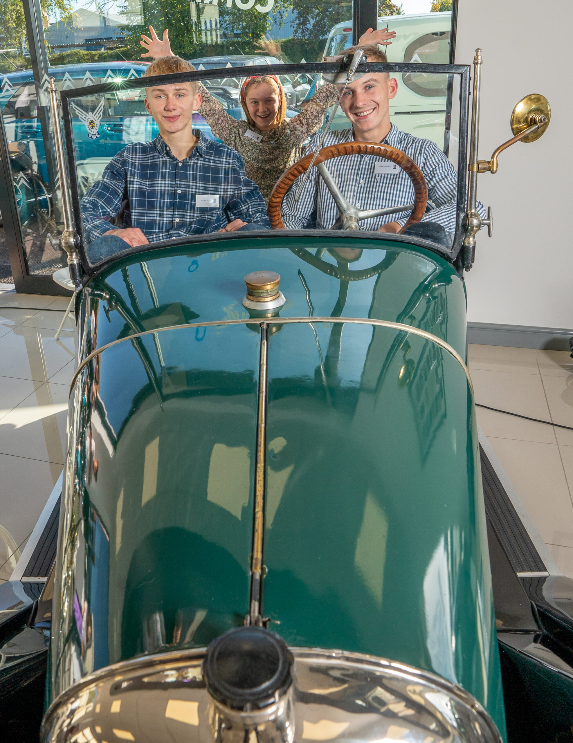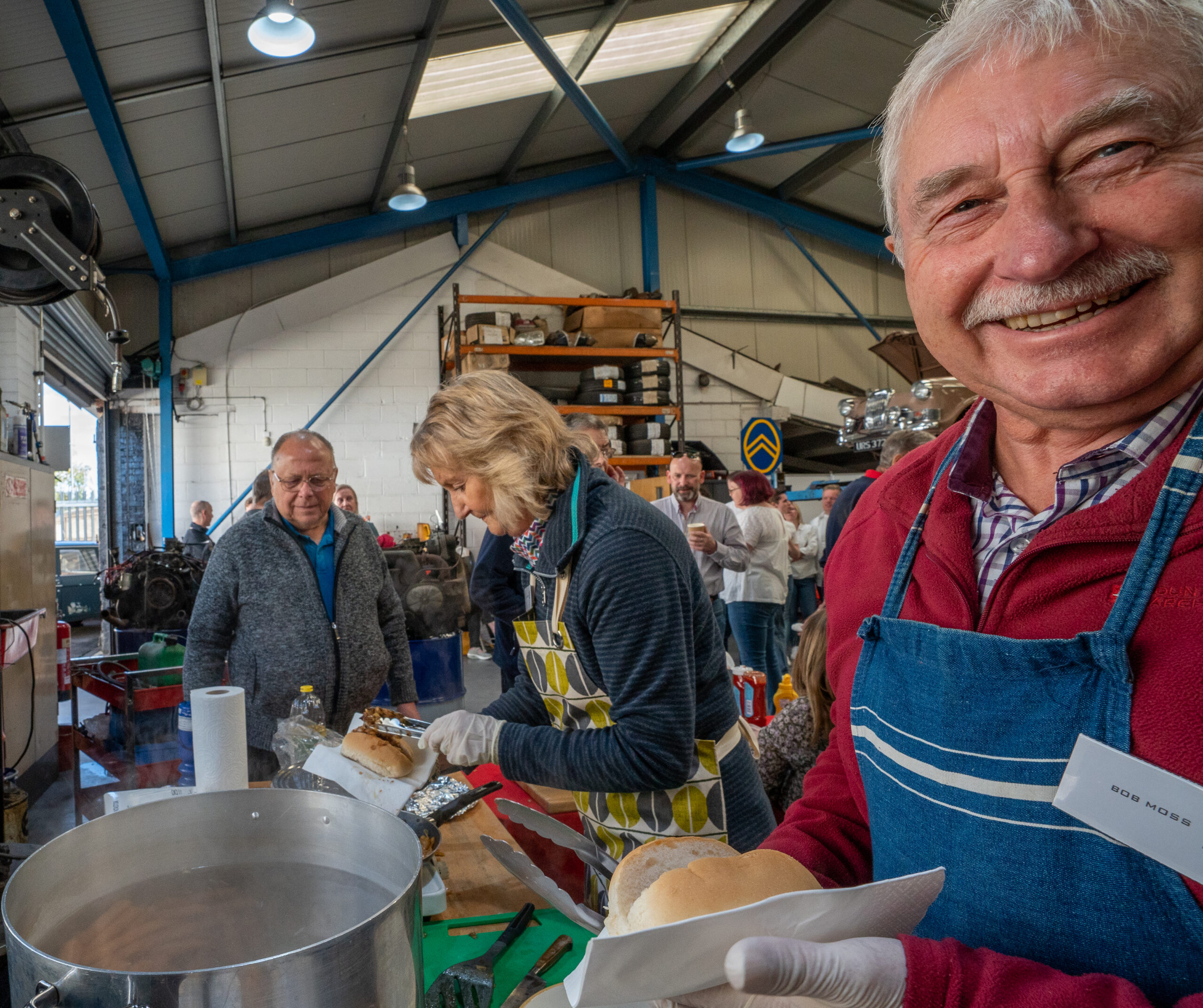 The open day had a programme of events running , spectators could see a windscreen being removed and refitted. An engine being run on a bench. There was a speech talking about vehicle restoration , a jazz band for visitors to relax and enjoy.